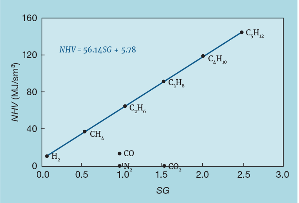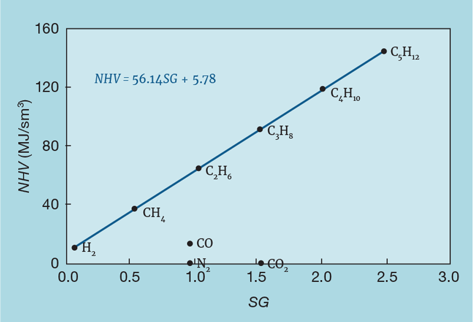 Figure 1 shows the relationship between NHV (in MJ/sm3) and SG for pure components. In principal, measuring SG, required for the flowmeter correction, also allows us to infer NHV. As shown, we can calculate the coefficients 56.14 (a) and 5.78 (b) from the physical properties of the components. However, site fuel gas systems can contain small quantities of other gases that don’t match the prediction. These might have zero heating value, like CO2 and N2, or not be hydrocarbons, like CO. We therefore have to develop a correlation for the site in question. Most sites will routinely sample their fuel gas system, analysing the gas in the laboratory to give a full component breakdown. From this we can calculate NHV and SG.
