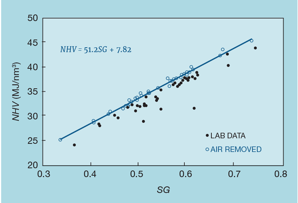 Figure 2 shows such data. The original data (the solid points) show a poor correlation, but examination of the analyses shows that oxygen is regularly one of the components. Unlikely to be present in the site’s fuel system, it has been introduced by the sampling procedure. We can readily remove it from the calculation of NHV and SG but, since it was introduced as air, we also remove the associated nitrogen – calculated as 3.73 times the oxygen content. Fuel gas can genuinely contain nitrogen, so some is likely to remain after removal of the air. Figure 2 shows the impact this technique has on the correlation – resulting in a reliable inference of NHV.