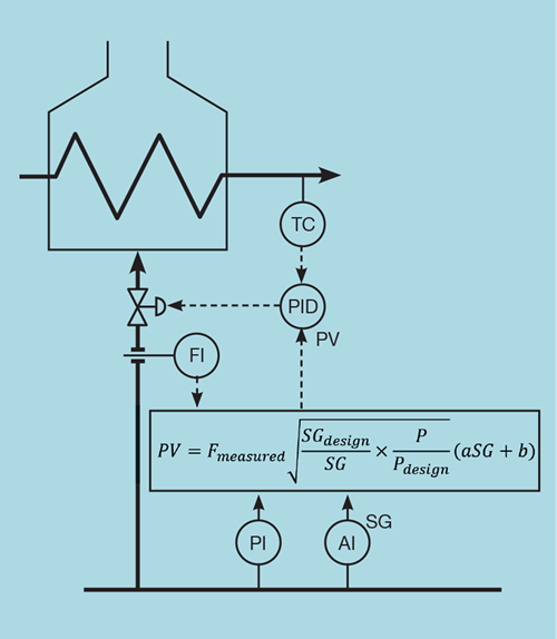 PERHAPS the most common technique for measuring gas flow is the orifice type flow meter. The orifice acts as a restriction; the pressure drop across which is indicative of flow rate. The instrument engineer, when designing the meter, will have used design conditions for molecular weight (MWdesign), pressure (Pdesign), and temperature (Tdesign). These values will have been used to determine the meter constant – the flow in engineering units when the meter records 100% of range. This factor is then used within the DCS to display the current flow (Fmeasured).