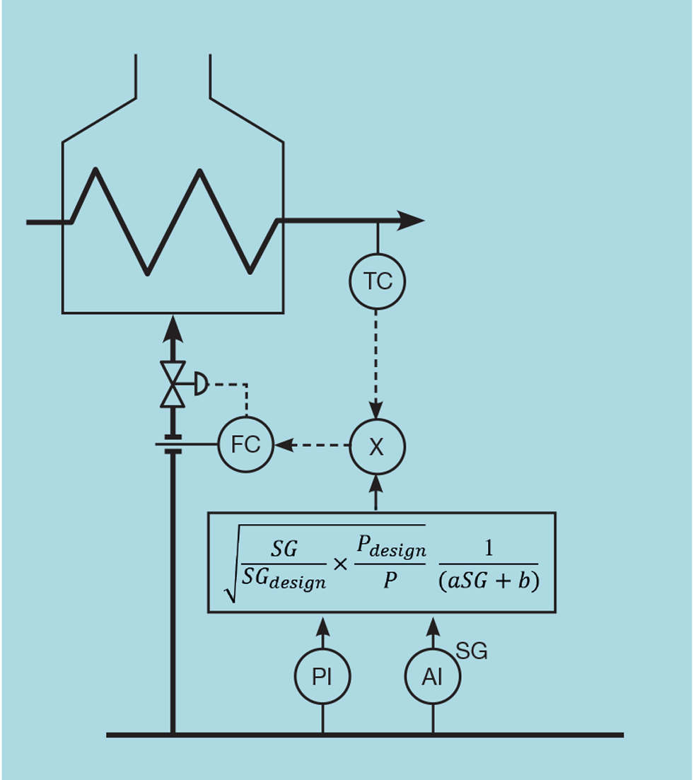 Alternatively, if the preference is to retain the flow controller, we can invert the correction. Multiplying the output of the temperature controller (the duty demand) by this factor then converts it to units of gas flow, as shown by Figure 4.