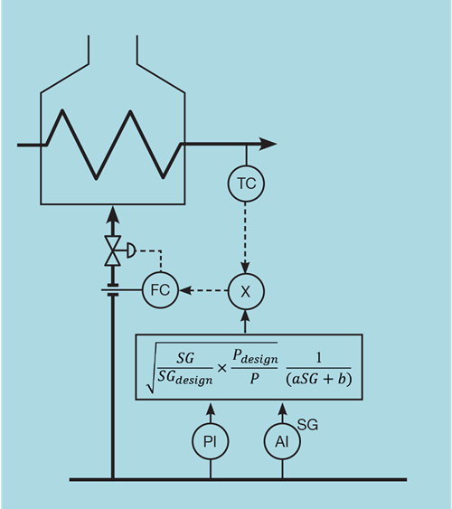 Examination of this equation shows that, on increasing SG, PV will increase. If now used as the measurement of a controller, this will close the control valve as required.