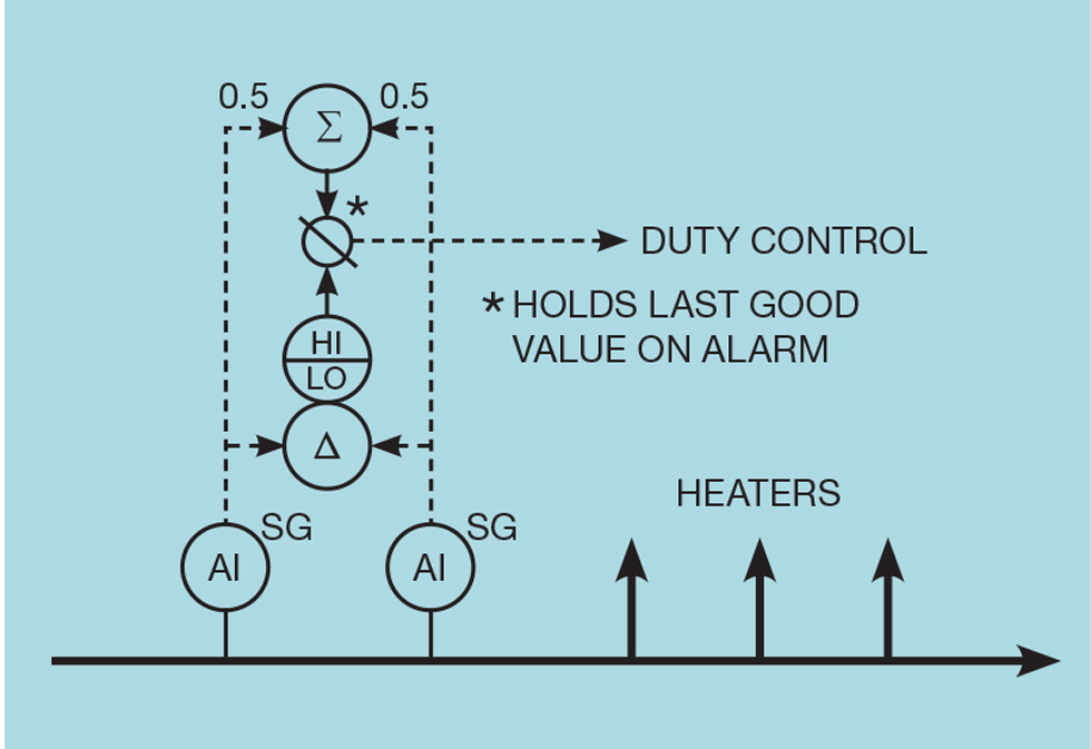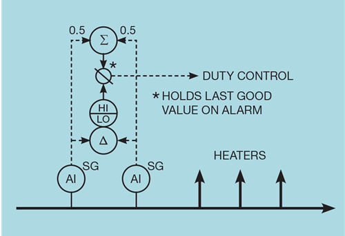 Figure 5 illustrates one possible approach, employing two analysers. Normally the average of their measurements is used but a large difference between them is treated as a failure. The value then used for control is frozen at the last good value. This gracefully degrades the duty controller – retaining all its other features. We would need to decide on what action should be taken when the analysers are again working. If the SG has changed during their omission, then the feedback controller will have adjusted the duty controller setpoint. Recommissioning analyser correction will be treated as a change in SG and will unnecessarily bump the process.