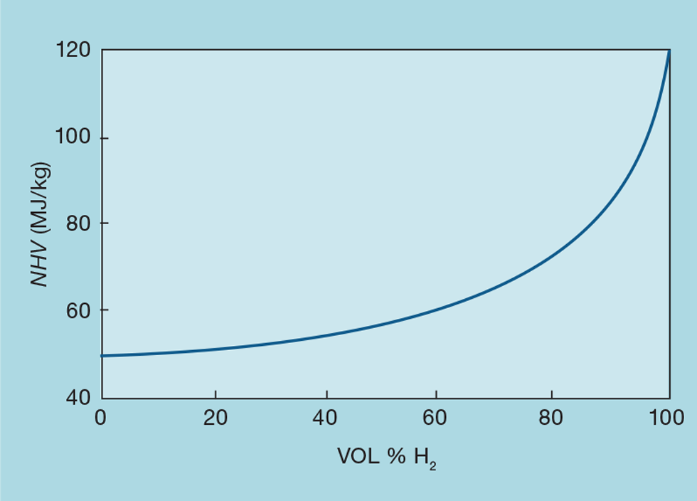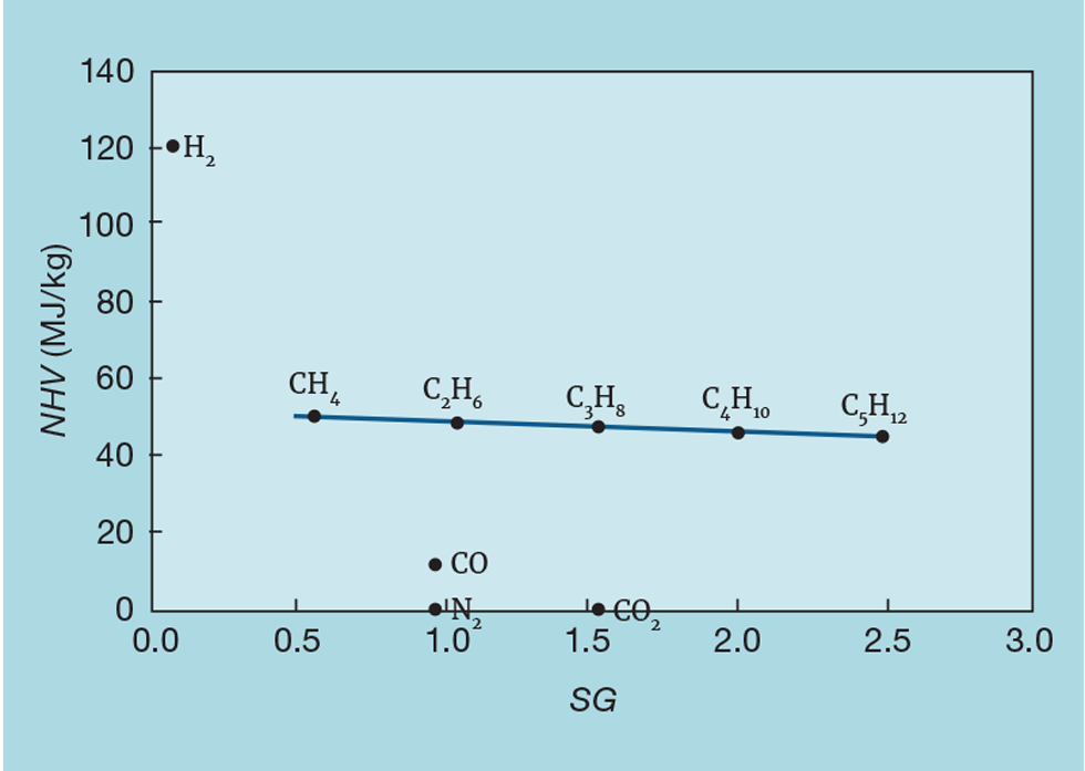 Of consideration, if the gas is a fuel, is its heating value. There are two measures of this. Here we will use net heating value (NHV) – on the basis that any water produced as a combustion product stays as vapour. Should the water be condensed, then the larger gross heating value (GHV) would be applicable.