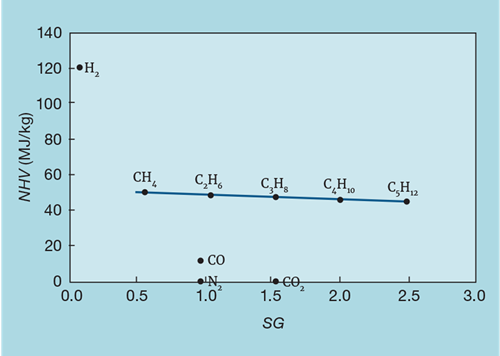 Figure 6 shows the relationship between NHV (now in mass units) and SG. Provided hydrogen is not present in significant quantity then the NHV changes little with composition. So, by choosing a flow meter that directly measures mass flow (such as the Coriolis type), we do not need a SG analyser (while most Coriolis meters also provide a measure of density, this is determined at stream conditions and so, unless pressure and temperature are measured, cannot be used to infer MW or NHV).