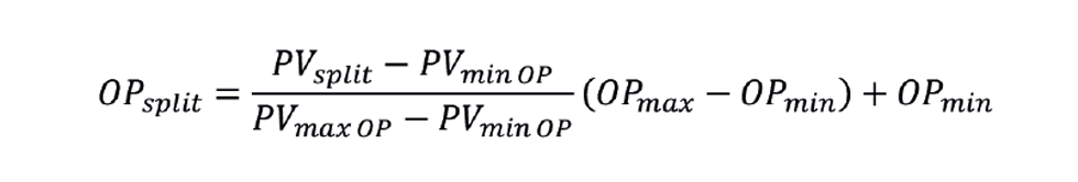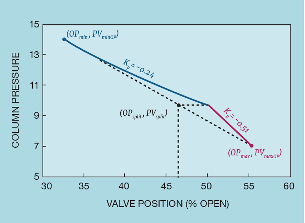 A key disadvantage of split-ranging is that the column pressure controller will require very different tuning, depending on which valve it is manipulating. Split-ranging compels us to choose a single set of tuning constants. A potential solution is to move the split away from 50%. Figure 5 illustrates this. The blue line shows how column pressure varies as we move the coolant valve; the red line as we move the vapour valve. Data to plot these lines could come from the plant historian or from a test run. They illustrate the tuning problem. As the controller output crosses the current split at 50% the slope of the line, which is the process gain (Kp), changes by a factor of around 2. Using the formula below we can calculate that the split should be moved to 46.5%.