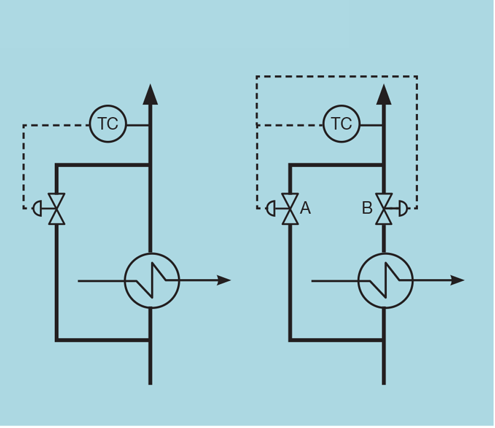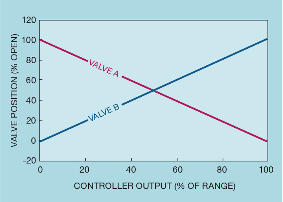 The first relies on a single, conventionally calibrated, control valve in the bypass. Should the product temperature be too low, the controller will open the bypass valve. However, this may not offer a sufficient range of operation. Even with the bypass fully open, some product will pass through the cooler. By adopting the second scheme, as the controller opens the bypass valve A, it simultaneously closes valve B in the line through the condenser. This is achieved by calibrating the valve positioners as shown in Figure 3. While drawn in the same way as a split-range scheme, because the valves move simultaneously, they are described as dual-acting.