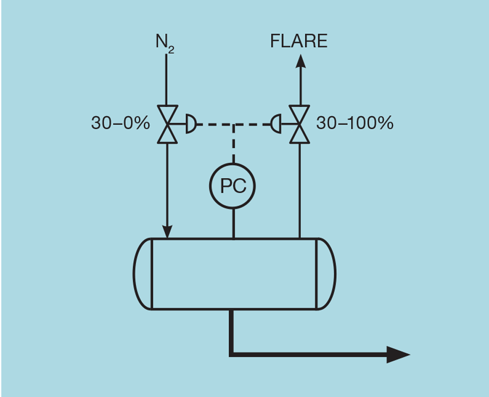 To ensure the valves operate over their whole range, some leeway is included in their calibration. It is common to allow a controller output to vary over the wider range of (say) -5 to 105% to ensure that the valve can be truly fully closed and fully opened. We can exploit this by following the same approach as that on the column. Installing two pressure controllers will then avoid overlap and deadband.