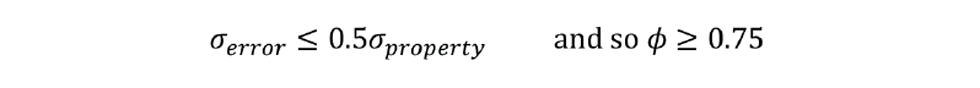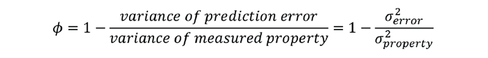 So why is this relevant to predicting product quality? Well, we often install an inferential because the existing quality measurement is a laboratory result that is reported maybe once per day. We want the inferential to give us a much earlier indication of a significant change in quality. If it fails to do so, even if infrequently, it is of little value. Similarly, an inferential which accurately predicts an unchanging property adds nothing. Whatever parameter we choose to monitor performance must take account of not only how close the inferential matches the measured property, but also how much the measured property changes. One which does this is the performance index (φ) where: