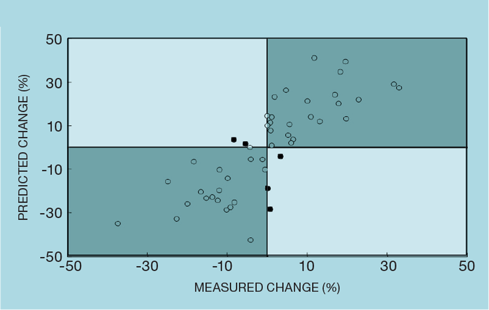 Figure 2 plots exactly the same data, but as a scatter chart. So, for example, if our inferential reports a value of 50%, the true value might be anywhere between 30 and 70%. However, this does not mean it is without value, remembering that the main role of the inferential is to give an early indication of a change. Provided it changes in the right direction, it might still be of use, even if only approximately correct. Figure 3 shows that, in this example, the predicted direction of 90% of the changes is correct. And, when it is incorrect (outside the shaded area), it tends to be for the smaller changes.