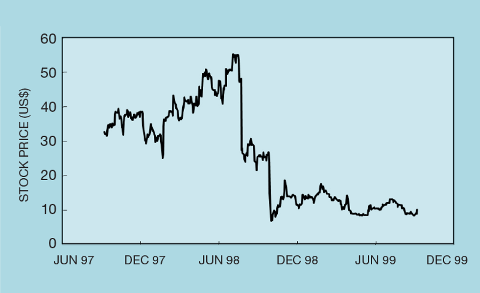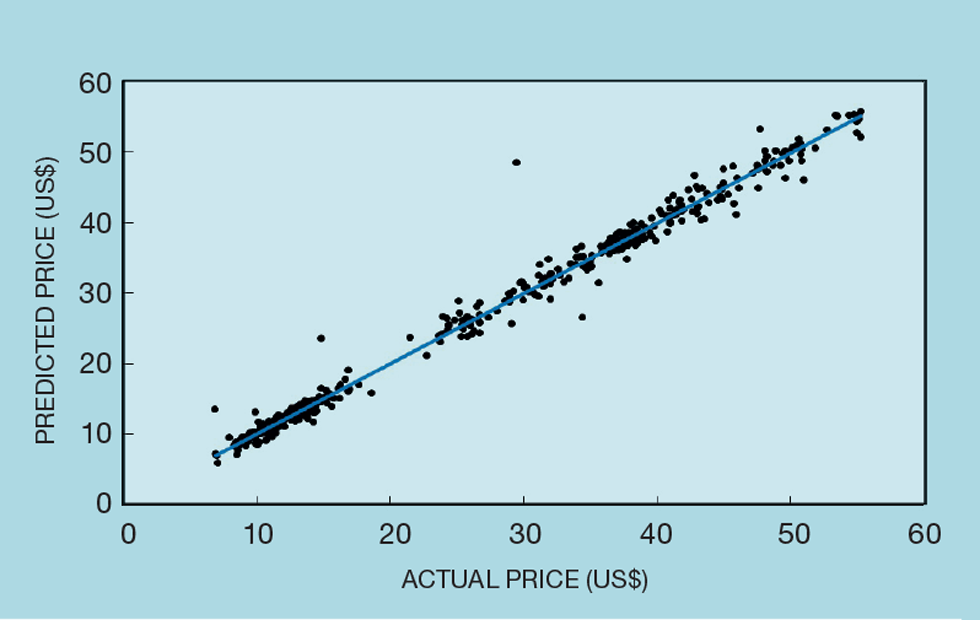 We can illustrate this with a real-world example. Figure 4 plots the stock price of a well-known US tech company. Those around at the time might remember the company and the issues it had to deal with. Figure 5 shows the results of a stock price predictor developed by yours truly. It’s R2 is 0.989 – apparently very close to perfection. More recently the stock price approached US$250. So why am I not writing this article on my private island? The answer is illustrated by just one point in Figure 5, where the predicted value was around US$50, and the actual price was US$30. It failed to predict the fall that took place in July 1998.