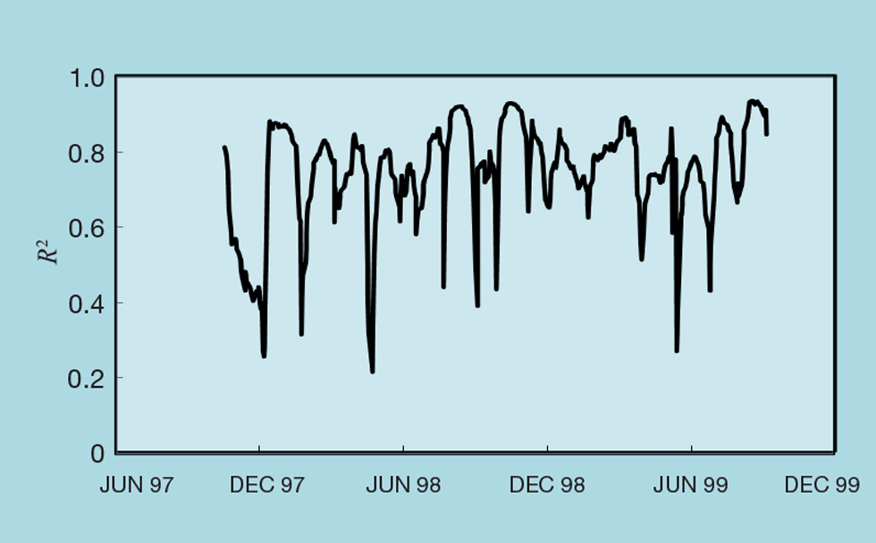 Similarly, if we were to calculate φ for the share price predictor we obtain the value of 0.989 – exactly the same as R2. But differences appear if we plot the parameters as rolling values based, for example, on the last 30 records. Figure 6 shows that R2 shows significant variation but never approaches 0. It tells us that the correlation always exists but not whether it is reliable enough to be used.