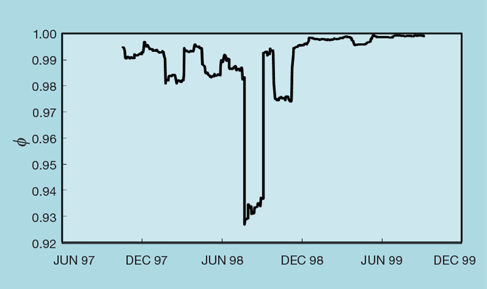 If we use φ to monitor the performance of an installed inferential, we must further modify its calculation. Let us imagine that, at design stage, φ was 0.75. In other words, σerror was half of σproperty. Also imagine that, on commissioning, our controller is perfect and achieves the objective of halving σproperty. As a result, f will reduce to 0 – falsely indicating that the inferential has no value. To resolve this, we use a constant value for σproperty, chosen as its value prior to commissioning the control scheme. Figure 8 shows the result, had our share price predictor been in service. It clearly indicates when the failure occurred. However, despite the problem being corrected for the next prediction, φ remains low for 30 days. Once a problem is resolved we need to delete the offending record(s) from the rolling calculation.