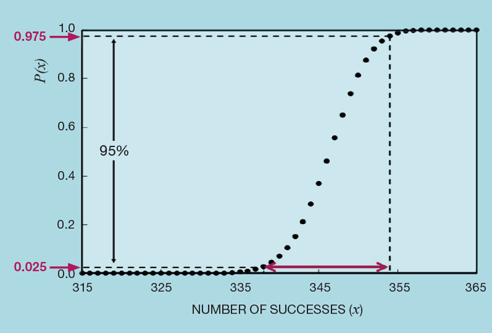 The Excel function BINOM.INV(n, p, P) gives the expected number of successes for a defined probability (P) in n independent trials where p is the probability of success in each trial. We might consider a year of daily checks on accuracy and so n is 365. We expect the inferential to be correct 95% of the time, so p is 0.95. We want to know how many of the trials will fall inside the 95% confidence interval, ie inside the range of P between 0.025 and 0.975. See Figure 9.