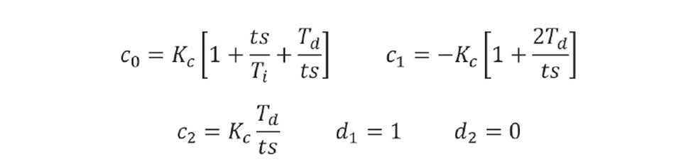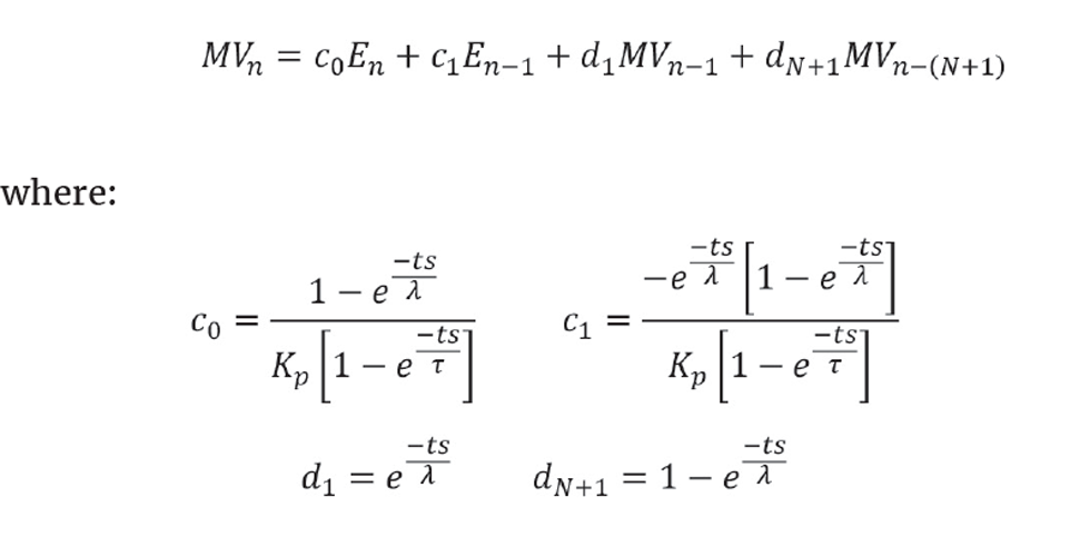 The term (λ) serves the same purpose as T2 in the IMC controller, ie it is an engineer-adjustable tuning constant that determines the trajectory of the approach to setpoint. Once set, the c and d coefficients can be automatically updated to account for any change in the controller scan interval (ts).