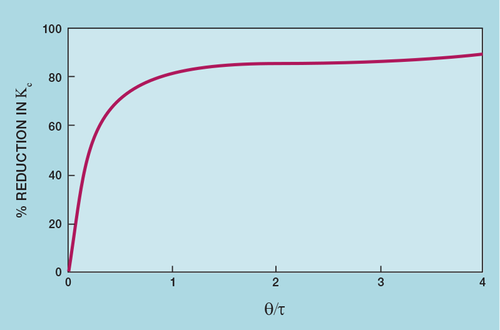 Figure 1 shows how much the controller gain (Kc) must be reduced as the deadtime-to-lag ratio (q/t) increases. So, for example, if the deadtime is half the lag, to prevent the controller from being oscillatory we need to reduce the controller gain by about 50%. This means, of course, that it will take twice as long to respond to setpoint changes and twice as long to resolve any disturbance. This problem becomes severe as deadtime exceeds lag – requiring a 90% reduction in controller gain.