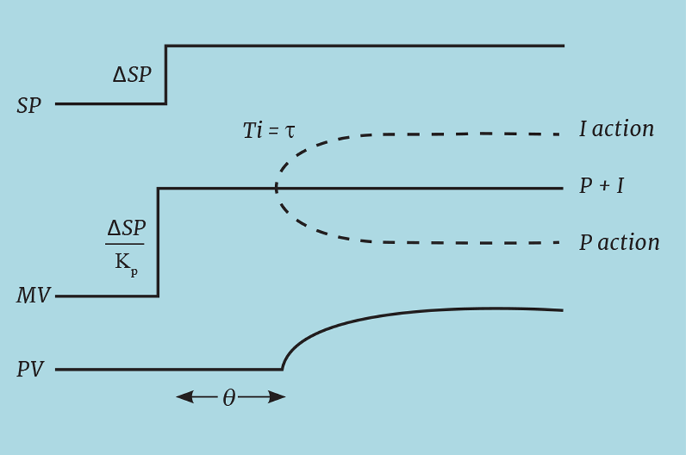 Many DCS (distributed control system) include a conventional proportional plus integral (PI) algorithm with the option to delay the integral action. In addition to the conventional tuning constants, it includes θ – the time by which the integral action is delayed. Once the process dynamics have been determined, in principle, tuning the algorithm is straightforward. The controller gain (Kc) is set to the reciprocal of the process gain (Kp). The integral time (Ti) is set to the process lag (τ) and θ is set to the process deadtime. Figure 2 shows how the algorithm responds to a change in setpoint. As usual, the proportional action multiplies the change in setpoint by Kc, so therefore divides it by Kp. By definition ∆PV is Kp∆MV so, after the process deadtime has elapsed, the PV will change by exactly the required amount, with no further action required. However, because it isunlikely that we have perfectly estimated Kp (or there may be a process disturbance), then ongoing correction will be necessary. This, as usual, is the role of the integral action – but now delayed by θ. However, in response to the original proportional kick, the PV will begin changing at the same time. The resulting reduction in error will cause proportional action but, if our tuning is perfect, it will be cancelled out by the integral action. If not, their combination will correct any remaining error in the conventional way.