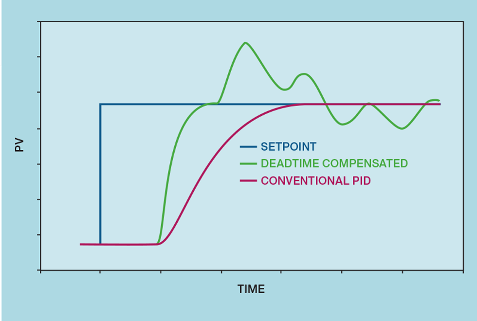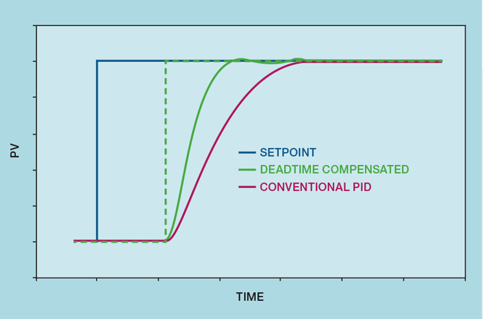 Figure 5 shows the advantage of these deadtime compensation algorithms compared to the use of the conventional PID controller. No controller can persuade to PV to change until the deadtime has elapsed. So, the dashed line might be considered as perfect control, but this could only be achieved with excessive MV overshoot. The properly tuned compensated controller outperforms the optimally tuned conventional PID controller. The time to reach setpoint (after the deadtime has elapsed) is halved.