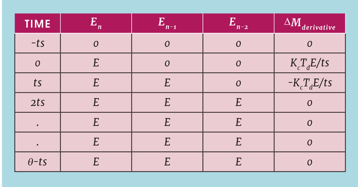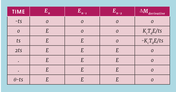 In principle, both the ideal and interactive algorithms are implemented in the control system as derived. However, the digital approximation causes a problem with the derivative action. Imagine that the process has been steady for some time and the operator causes a controller error by changing the set-point. Ignoring, for the moment, the action taken by the proportional and integral parts of the algorithm, the changes made by the derivative action are shown in Table 1. It causes a derivative spike that has a duration of one controller scan interval and a magnitude of KcTdE/ts. The value of Td will be around a minute or more, while ts will be few seconds. Td /ts will therefore be of the order of 60, so even a small change in set-point can cause M to change by more than 100%. Potentially the fuel valve could be fully open (or fully closed) for one scan interval. This may cause a serious problem in its own right, potentially causing a plant trip. Once the process deadtime has elapsed, the temperature will show a similar spike. This will be detected as an error and the controller will take corrective action causing the spike to repeat.