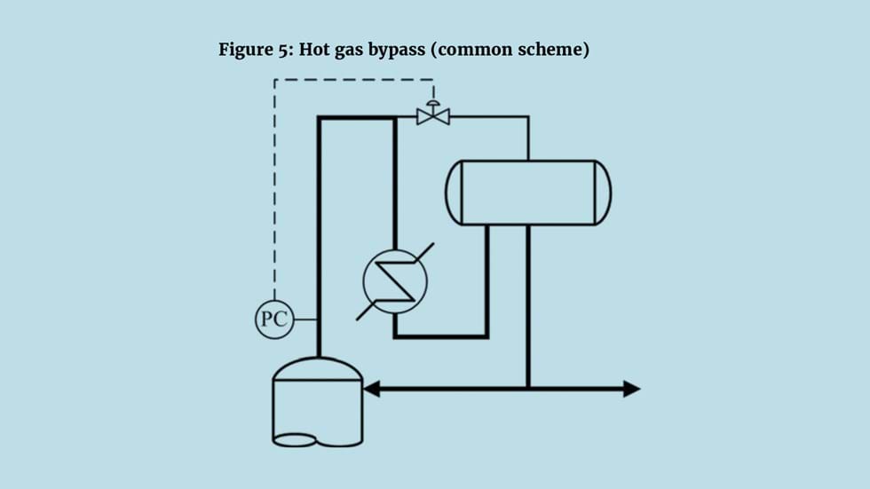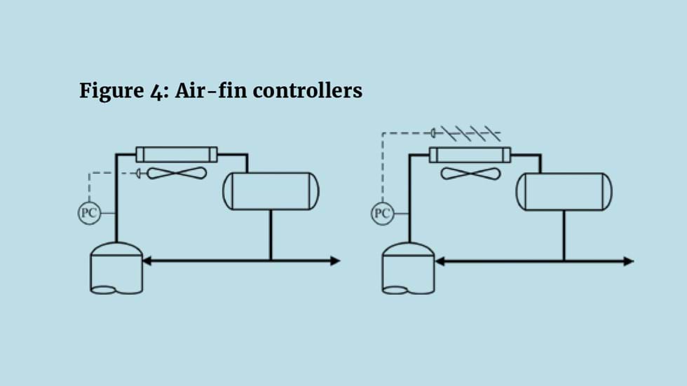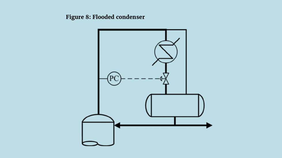 If the condenser uses a liquid coolant, for example water, then duty can be adjusted by varying the flow. For air-fin condensers, manipulating air flow is not so simple. The schemes, shown as Figure 4, include the use of variable speed fans, adjusting the pitch of the fan blades and adjusting louvres. All are costly and usually prove, because of the mechanics involved, unreliable. A common solution is to fix the air flow and install a vapour bypass – known also as a hot gas bypass. Figure 5 shows a commonly installed scheme. Although bypassing the condenser, the vapour is still fully condensed. Opening the bypass causes the vapour to be condensed in the drum where heat transfer is less efficient and so the pressure rises.