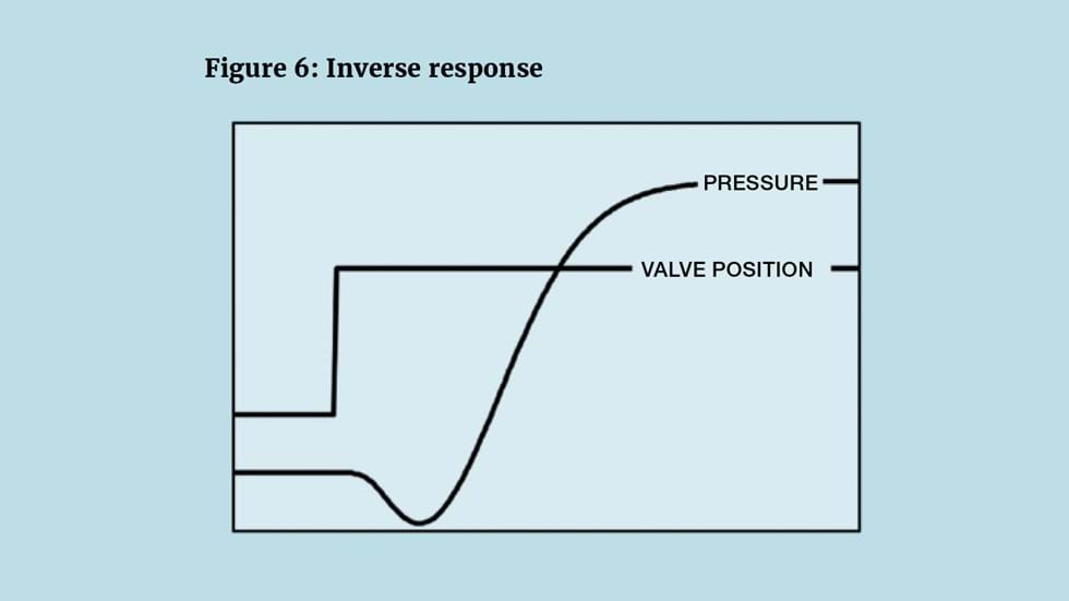ear to be a good solution. However, dynamically, it can present a major tuning problem. Figure 6 shows the result of a simple step test, along the lines of that described in TCE 981. As expected, at steady-state, opening the valve increases the pressure but it shows the phenomenon of inverse response. The controlled variable initially moves in the direction opposite to the steady state condition. Installing a PID controller under such circumstances is likely to be impractical. Any correction it makes would result in the controller error initially increasing – causing it to make a yet larger correction. Unless tuned to act very slowly, the controller is likely to be unstable. The problem arises because of the two competing effects of opening the valve. The first is the increase in vapour flow from the column to the drum, reducing the pressure. The second is the reduction in vapour condensation, increasing the pressure. But, because of the thermal inertia of the condenser, this will be slower. The first effect therefore initially wins out until the resulting increase in drum pressure restores the vapour flow close to its starting point.