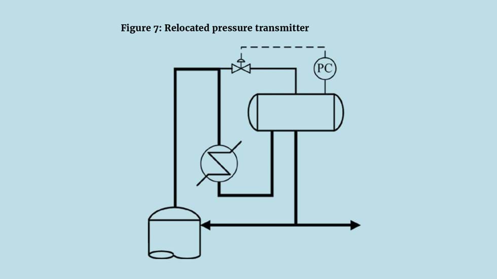 There are a range of alternative solutions that, because of the additional cost, might be rejected at the process design stage. One is shown as Figure 8. Instead of the valve being placed in the condenser bypass it now directly controls the flow through the condenser. Known as a flooded condenser it is now partially filled with liquid. Opening the valve reduces the liquid level, exposes more tubes and so increases condensation. The bypass line would now be described as a balance line maintaining the drum and column pressure equal.