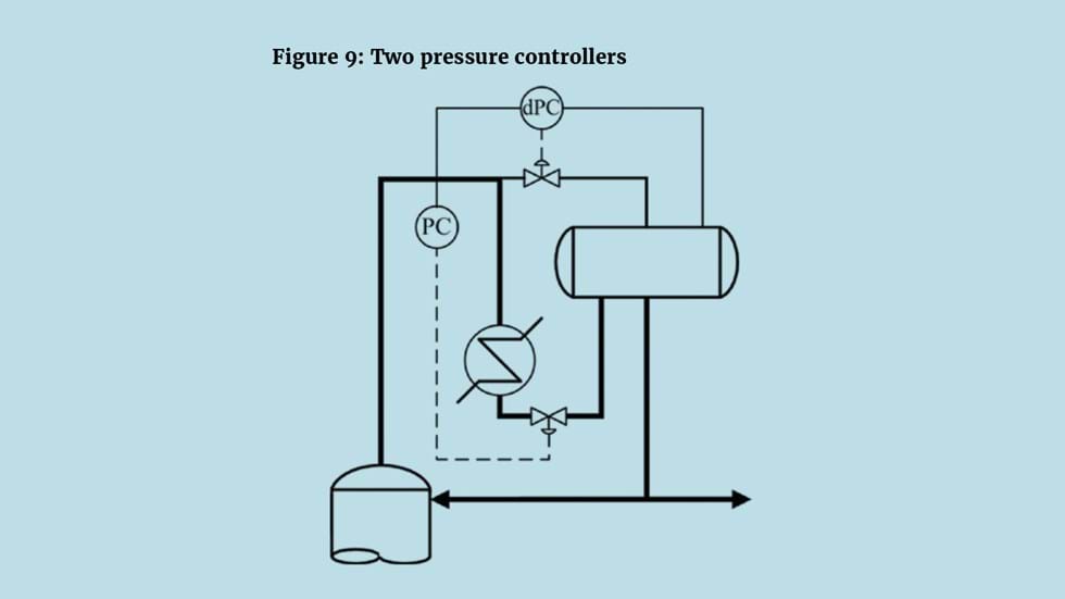 Perhaps the costliest solution is shown as Figure 9. With both valves installed, both drum and column pressures can be controlled. Rather than rely on the operator to ensure the drum pressure is kept sufficiently below the column pressure, a pressure difference controller is installed. Maintaining this difference ensures that opening the condenser valve increases the condenser duty without increasing the vapour flow to the drum. However, this introduces another problem for the control engineer – one of interaction. Imagine there is some disturbance that increases column pressure. The pressure controller will open the condenser valve to increase condensation. But the pressure difference will also increase. To relieve this, the dynamic process control (dPC) will open the bypass valve – reducing vapour condensation and so initially increase the column pressure. The two controllers will fight – requiring one be tuned to act very slowly and so sacrifice stability. There is a “quick fix” whereby the dPC measurement is configured to use the column pressure controller setpoint rather than its measurement. It then only corrects for changes in drum pressure. It breaks the interaction in one direction so that the controllers no longer fight but changes made by the column pressure controller will still affect the dPC. Of course, the best solution is for the process designer to select a solution other than the hot gas bypass.