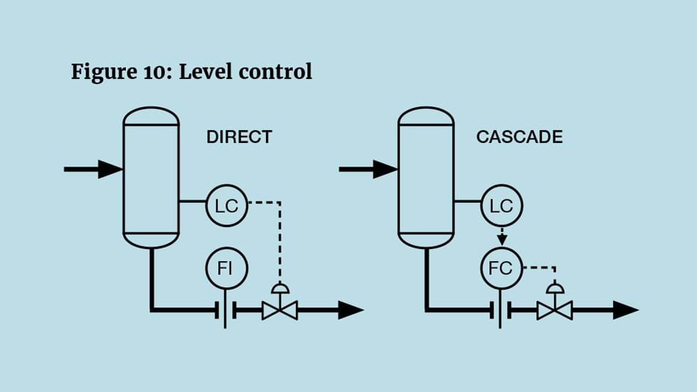 One of the largest improvements that can be made to process stability is the use of surge capacity. This might be deliberately included in the process design – such as a feed surge drum. Or it might be in a vessel that is installed for another purpose – such as the reflux drum we’ll see later in Figure 12. This capacity can be used by tuning the level controller to be averaging rather than tight (see TCEs 987 and 989). However, averaging control usually requires that the level controller be cascaded to a flow controller, as shown in Figure 10. Without this, the controller must be tuned tightly to maintain the level when either the upstream or downstream pressure changes. With the cascade in place, the flow controller will quickly compensate for pressure changes – leaving the averaging level controller to smooth out flow changes. So, at the process design stage, it is important to decide whether the flow controller is required. Should tight level control be required, for example, on a compressor suction drum then it’s right that direct level control be installed. While it might be useful to have a flow measurement for monitoring purposes, its inclusion in the control scheme will make a critical controller more susceptible to instrument failure. The are many examples where averaging control would have been advantageous but the process design excluded the necessary flow measurement. Orifice type meters require 30 pipe diameters of straight pipework. This is unlikely to be in place and so retrofitting would be prohibitively costly. During commissioning, level controllers should be placed in automatic as early as possible. Unlike most other measurements which are self-regulating and naturally reach new steady state, levels are integrating (see TCE 990/991) and so require much more attention when in manual. Most level controllers can be tuned based only on process design data. Such tuning calculations should form part of the process design.