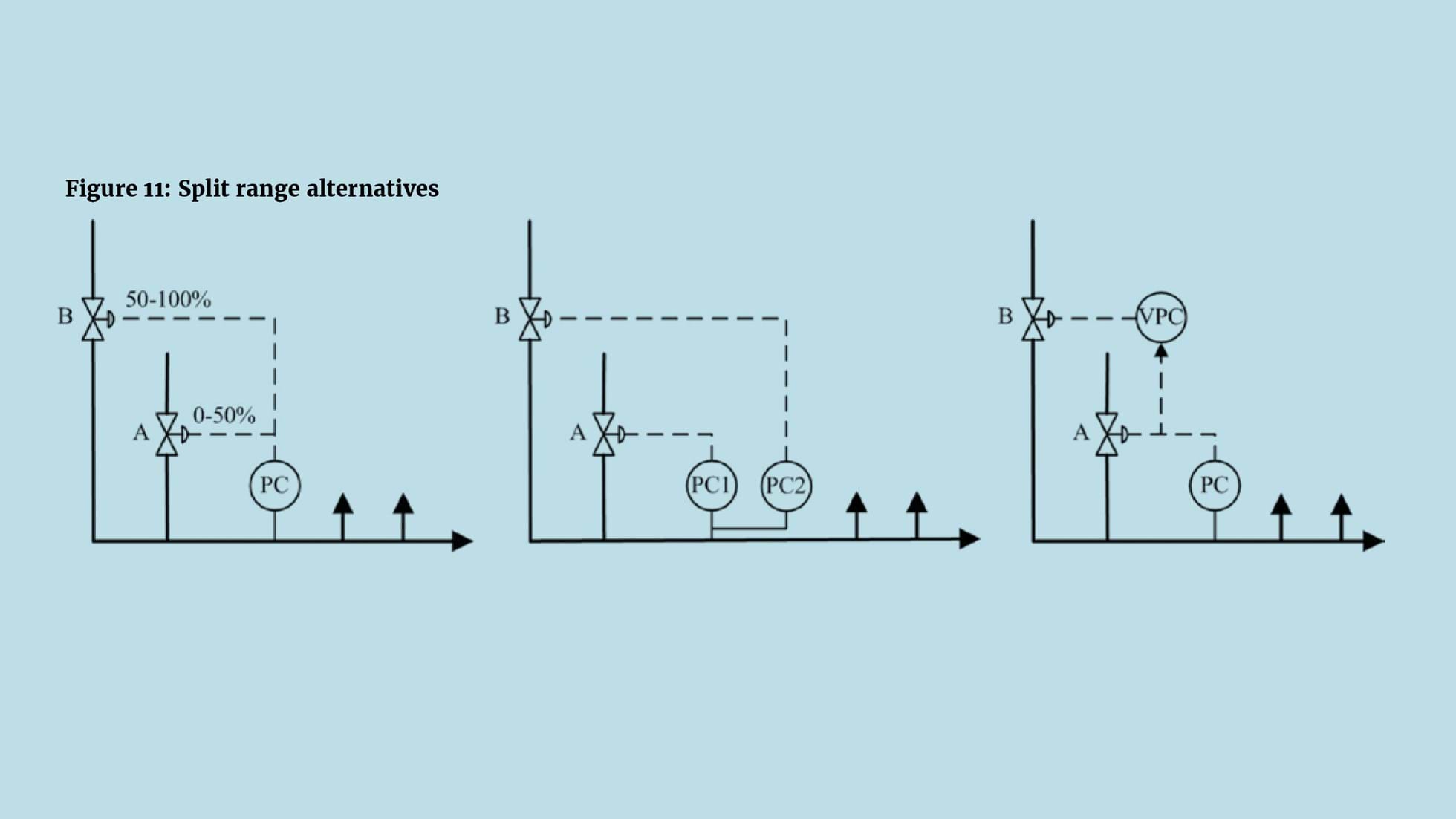 Split-ranging (TCE 1,004) is a technique that extends the operating range of a controller by sequentially adjusting more than one valve. Figure 11 shows the pressure controller of a fuel gas header. Preferentially gas supplied via valve A should be consumed first. If this flow is at maximum, and the valve is 100% open, then valve B is opened as required. In the first scheme, the pressure controller output is split into two ranges. As it changes from 0 to 50%, valve A moves from 0 to 100% open. As the PC output increases from 50 to 100%, valve B opens 0 to 100%. When instrumentation was entirely pneumatic, this scheme had cost advantages in that both valves connected to the same copper pipe.