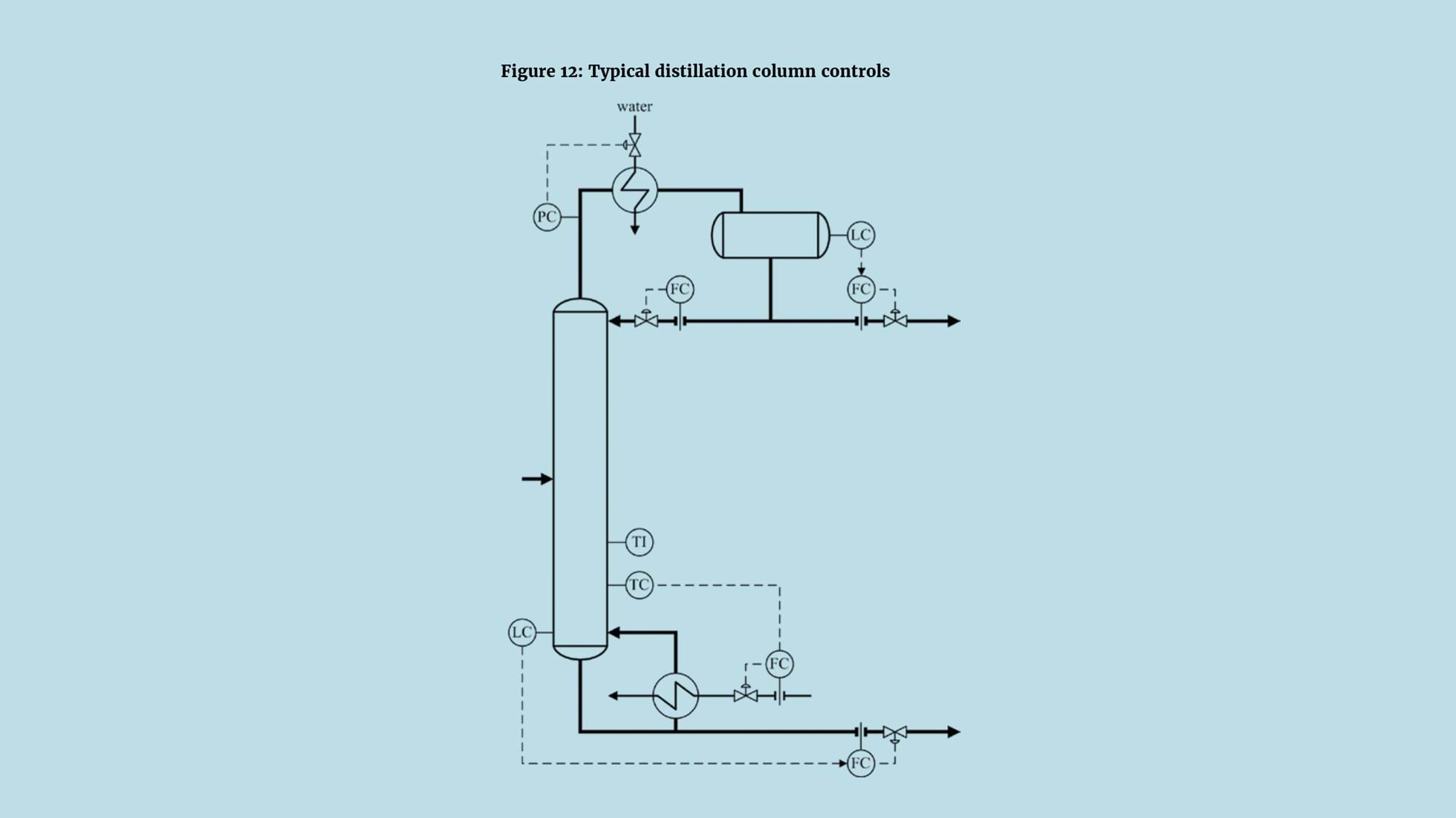 Figure 12 shows a typical control design for a binary distillation column. The tray temperature controller is a simple inferential in that the bottoms composition is related to the bubble point measured in the lower section of the column. This relationship is pressure-dependent; to accommodate changes we install a pressure-compensated temperature (PCT), as described in TCE 996. On most columns the pressure measurement used for control can be used in the calculation but this is not the case for vacuum distillation. Here the pressure drop across the column is significant compared to the operating pressure. In addition to that at the top of the column, used for control, a pressure measurement close to the tray temperature should also be installed.