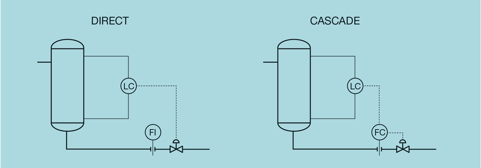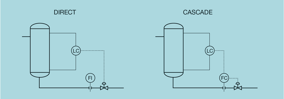Before tuning the controller we must decide whether the control should be direct, with the level controller manipulating the control valve, or cascade, with the level controller manipulating the set-point of the flow controller. See Figure 2. If we require tight control, there is little advantage in the cascade approach. Indeed, we might value the increased reliability of a scheme that would not be affected by a problem arising with the flow measurement. However, for averaging control, the cascade has an advantage. Remembering that we want to keep the downstream flow as steady as possible, consider the effect of a pressure disturbance. If the drum pressure increases (or the downstream pressure decreases) there will be an initial increase in the liquid flow. If we have the direct acting scheme in place, we must install tight level control to correct the flow imbalance across the drum quickly and so maintain a constant flow.