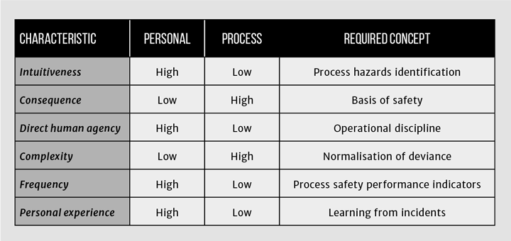 Table 1 shows six different characteristics that can be applied to safety events (incidents), how these characteristics differ between process and personal safety events, and the process safety concept that arises from the difference.