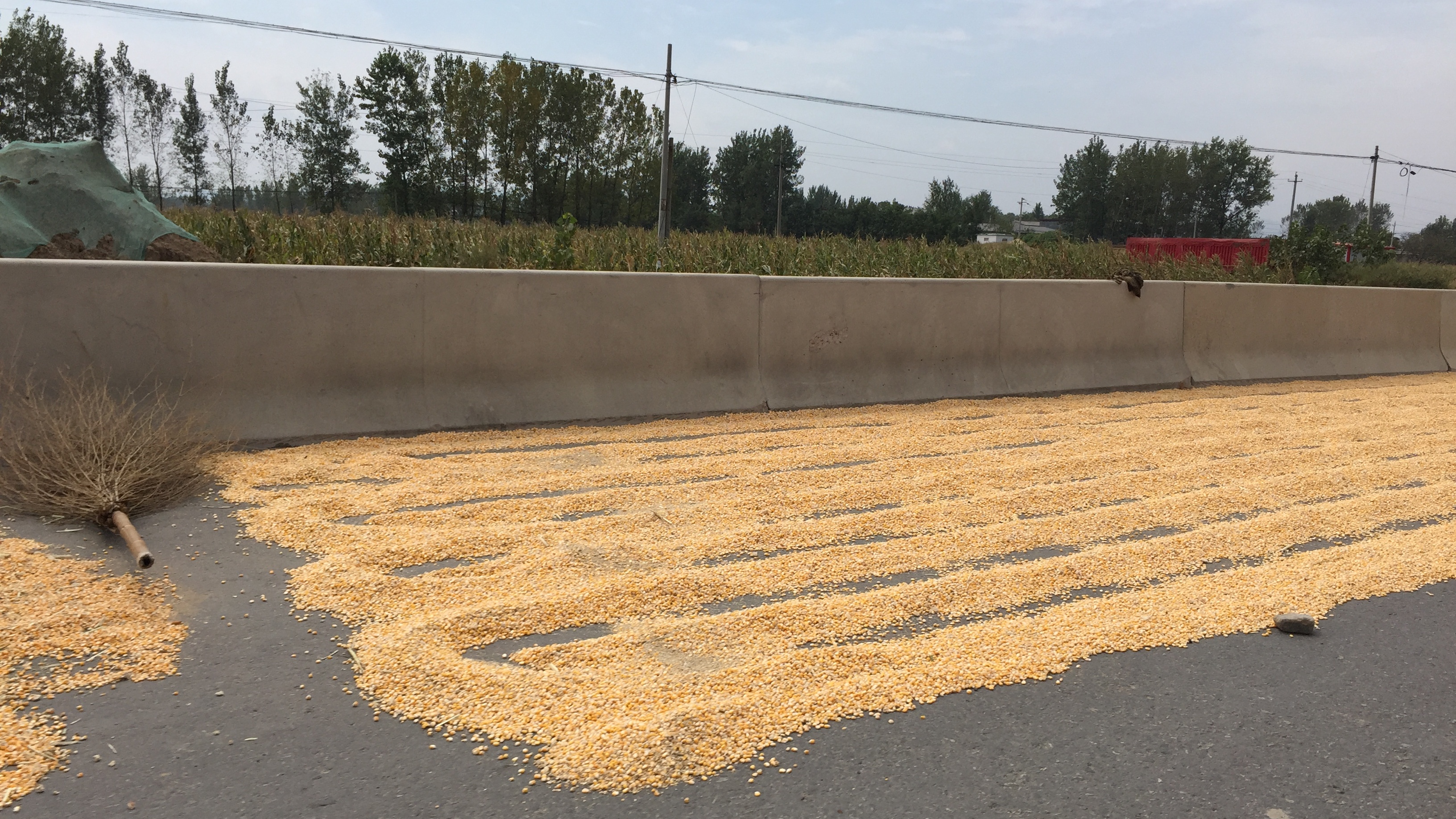 Where the roads were tarmacked, they had been commandeered to dry corn. Great yellow carpets, made up of millions of individual kernels, lined the roads, reducing the surface to one narrow lane, protected from the traffic by judicious placing of green beer bottles.