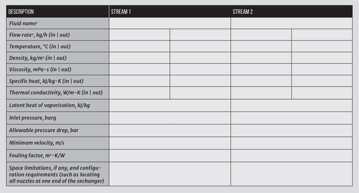 Table 2 lists the minimum data that the engineer’s specifications should include. The manufacturer will provide physical properties unless the fluids are unusual.