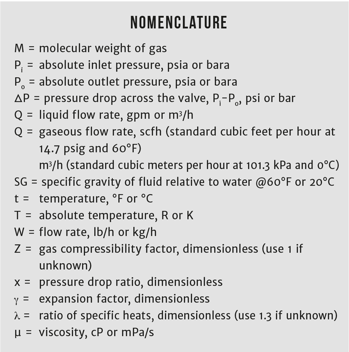 The first step in sizing a valve is to specify the flow rates and pressure drops at the high and low extents of the control range. Engineers often make the mistake of specifying a wider range than is necessary, thinking that this gives a conservative cushion in the sizing. When coupled with other conservative assumptions and calculations, an oversized valve is supplied, which results in suboptimal control because valves are usually most responsive when they operate closer to the fully open position (60-80% open). If you can dictate the pressure drop through the valve, use 20% of the total system pressure drop or 10 psi (0.7 bar), whichever is greater.