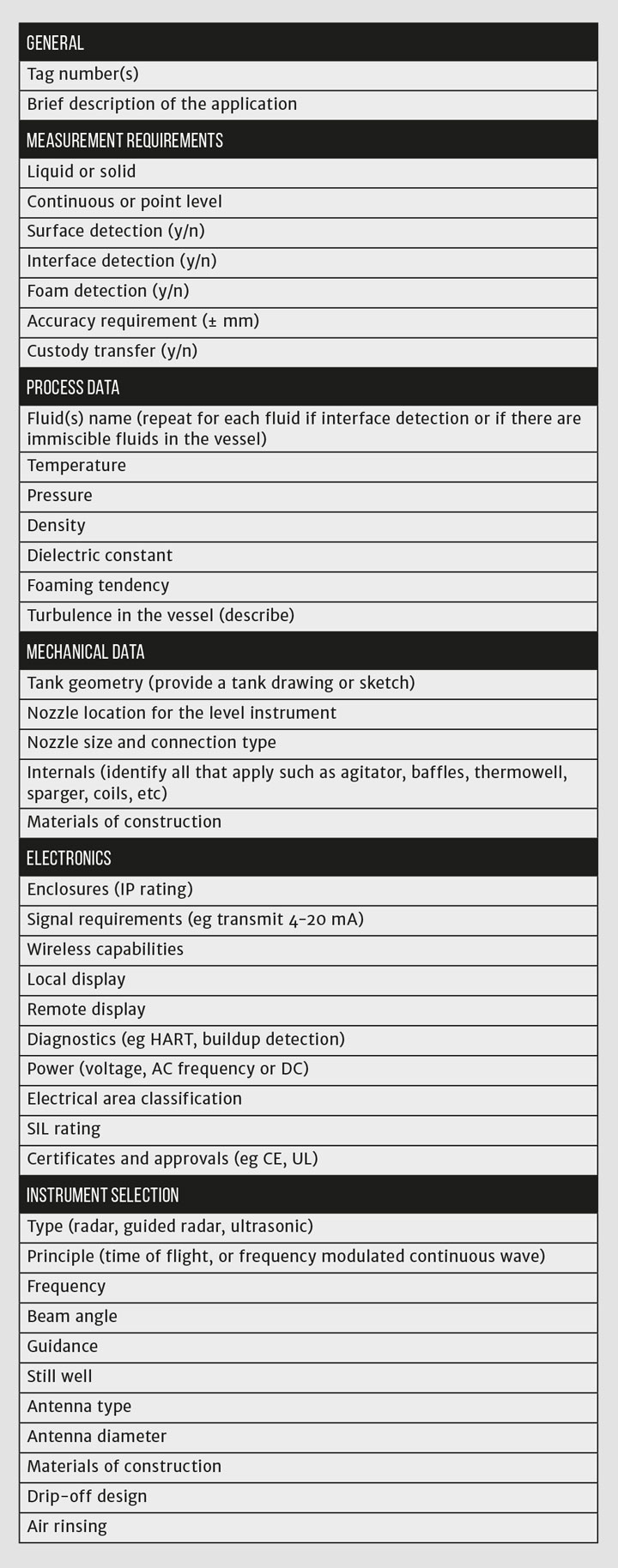 Table 1 is a checklist of information that defines requirements for a radar level sensor and transmitter. A “free space” radar has an antenna that beams the signal toward the target. “Guided” radar adds a physical path that the signal propagates along. The purchaser should gather as much of this information as possible before soliciting proposals from vendors. Some items, especially in the “instrument selection” section, may be furnished by the vendor.