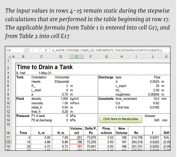 FLUID flow principles can be used to calculate the time needed to drain the contents from a tank. This month I will show you how. The formulas for tanks with simple geometries can be integrated to give an elegant solution. You can approximate the time it takes to drain a tank for other shapes by using the integrated form from a similar tank, or by performing stepwise calculations to integrate the formulas using brute force, the method that I am describing here.