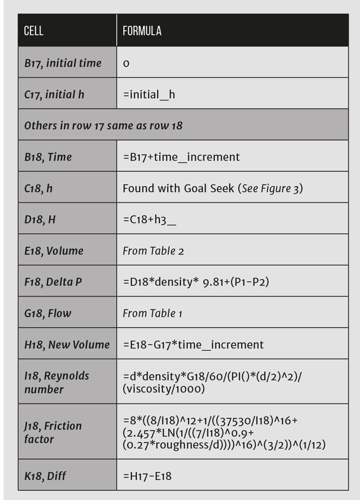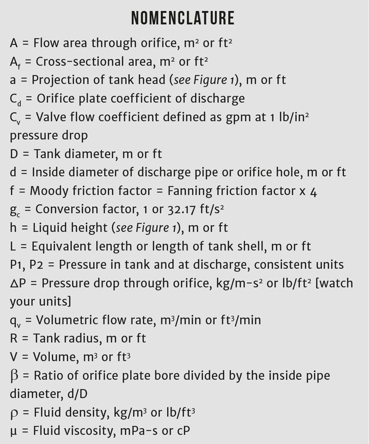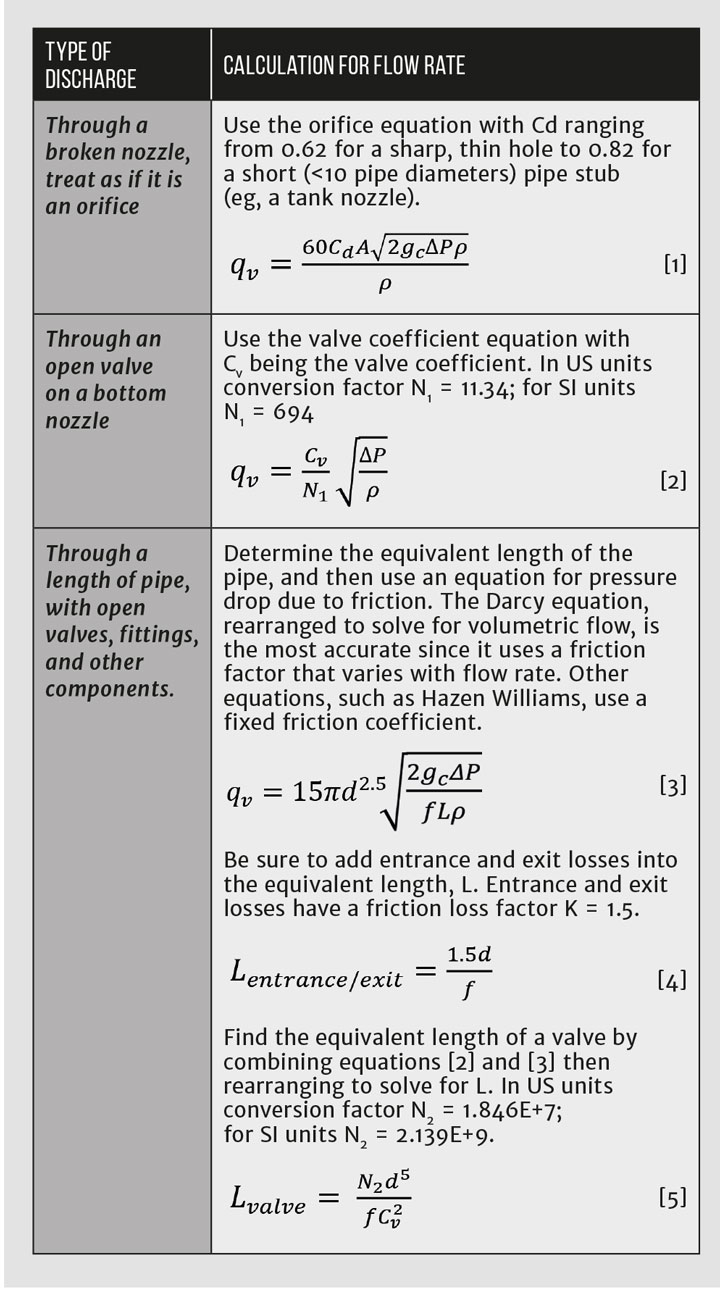 Start by sketching the system. The sketch will clearly illustrate the tank with dimensions, head pressure, discharge piping (if any), and discharge pressure. Add the fluid density and viscosity to the sketch (see Figure 1). Using the equations in Table 1, calculate the initial discharge flow rate from this information. Choose a time interval for the calculation, such as 5 or 10 minutes. Assuming the flow rate is constant over the time interval, calculate the volume that flows from the tank and subtract it from the inventory in the tank. From this new inventory calculate the reduced level in the tank (see Table 2 for formulas). This changes the liquid head for the flow rate calculation so recalculate the flow and repeat until the tank is empty.