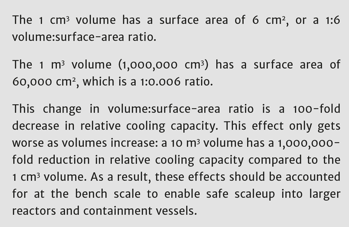 Here’s the basis of the scaleup challenge: volume increases at a quicker rate than surface area does. Cooling through surface temperature losses at the lab scale is not replicated at a large scale. A simple example of this effect is the difference in the volume:surface-area ratio between cubes of 1 cm3 volume and 1 m3 volume.