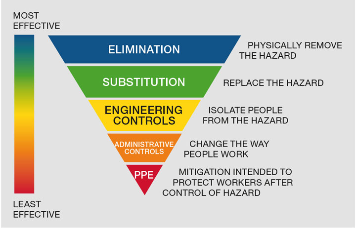 Correct application of the hierarchy of controls requires them to be considered in order, each with decreasing effectiveness, and therefore impact, on reducing risk – first employing inherent safety principles to eliminate, minimise, substitute, or simplify the hazard and only thereafter considering engineering or administrative steps to control it, and finally personal protective equipment (PPE). Following this hierarchy will lead to the implementation of inherently safer systems.