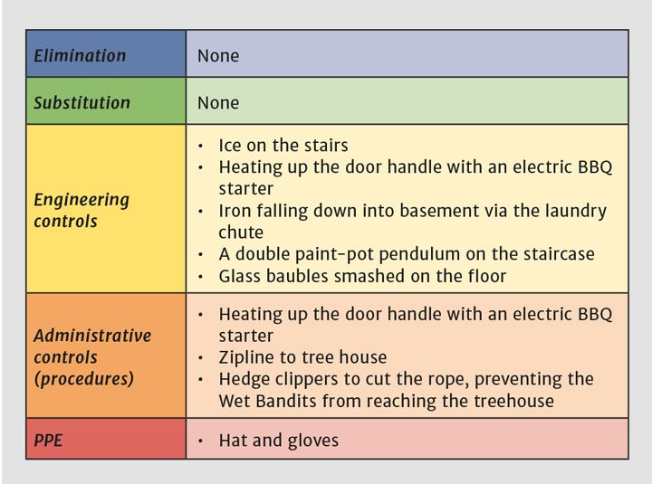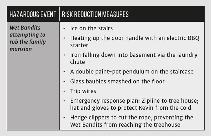 Ahead of the Wet Bandits’ anticipated arrival, he implements his battle plan: a series of well-thought-out control and mitigation measures designed to defend his home – from using an electric BBQ starter to create a searing hot doorknob, to scattering toy cars at the foot of the stairs (see Table 1).