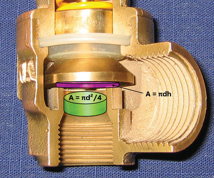 The relief valves shown have relatively high Kd values, but they can be much lower. One of the reasons for this is the lift of the relief valve, which is the distance between the nozzle and the valve seat. When relief valves are sized, it is the orifice area that is determined, which is shown in green in Figure 1. For high lift valves (high Kd value valves) the orifice is the minimum flow area and defines the flow. However, for low lift valves it is the curtain area (shown in purple in Figure 2) which is the minimum flow area. Valves are specified using orifice areas, not flow areas, so the valve shown in Figures 1 and 2 will have a low Kd, and if the engineer has used a value of 0.975 in their calculations then the valve will be undersized by a significant factor.