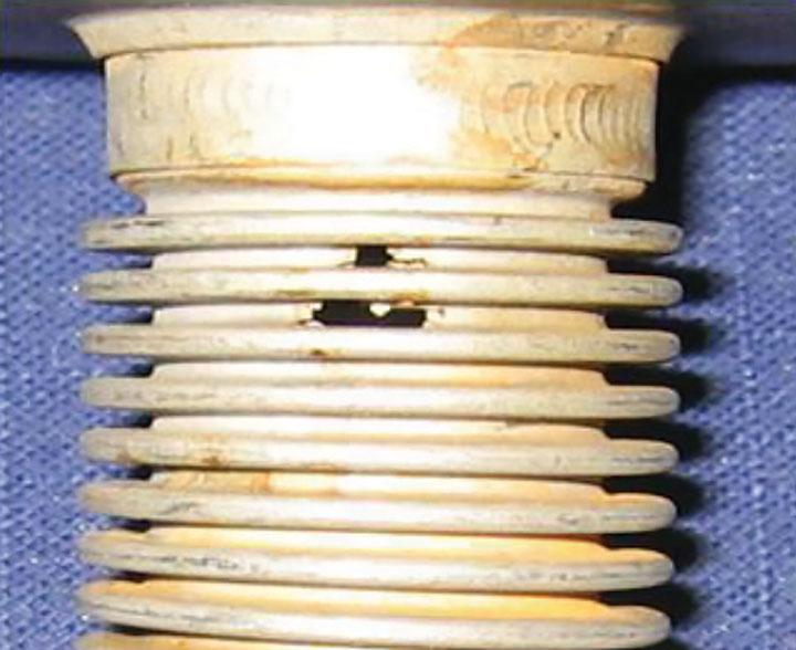 A good example of where incorrect material of construction can cause issues is balanced bellow valves. Typically the material of construction of the bellows is stainless steel, as it is cheaper than more resistant materials such as Inconel. The bellows are critical for the performance of the valve in order to withstand built-up back pressures and variable superimposed back pressures. However, if there is a failure of the bellows (see Figure 3), then the valve effectively acts as a conventional type valve potentially leading to maloperation at the time it is required.