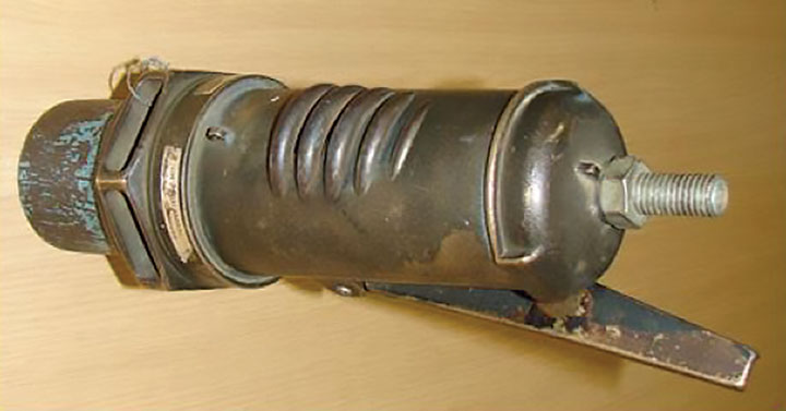 Typical relief valves should be installed in a vertical position, with the spring acting towards the ground. This is simply because they are designed to be installed in this orientation, and if they are horizontal they may not open and close as designed. The vast majority of relief valves are installed in the correct position, but there are examples where space constraints or line pressure drops have led engineers to install them horizontally. Figure 5 shows one such valve which was installed horizontally on an air compressor. Vibrations caused the spring to erode the metalwork to such an extent that it protrudes through the bonnet, rendering it useless. This is an extreme example, but demonstrates the point very well.