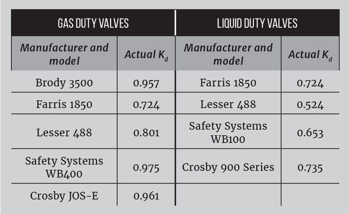 Table 2 shows a list of actual Kd values from a variety of makes and models of relief valves. The important point to note is that they are all different, some closer to the API 520 value than others.