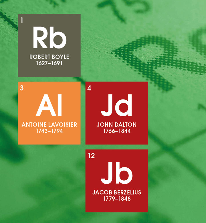When we write chemical formulae like H2O, CO2, NaCl, and then use them to write out chemical equations, we need to thank Jacob Berzelius (1779–1848), a Swedish chemist considered one of the four founders of modern chemistry. The others are Robert Boyle (1627–1691), of Boyle’s Law, John Dalton (1766–1844), who essentially gave us the theory of atoms, and Antoine Lavoisier (1743–1794), who changed chemistry from qualitative to quantitative and gave us the first list of elements. His quantitative measurements on combustion disproved the phlogiston theory, and showed that “dephlogisticated air” was in fact an element – oxygen.
