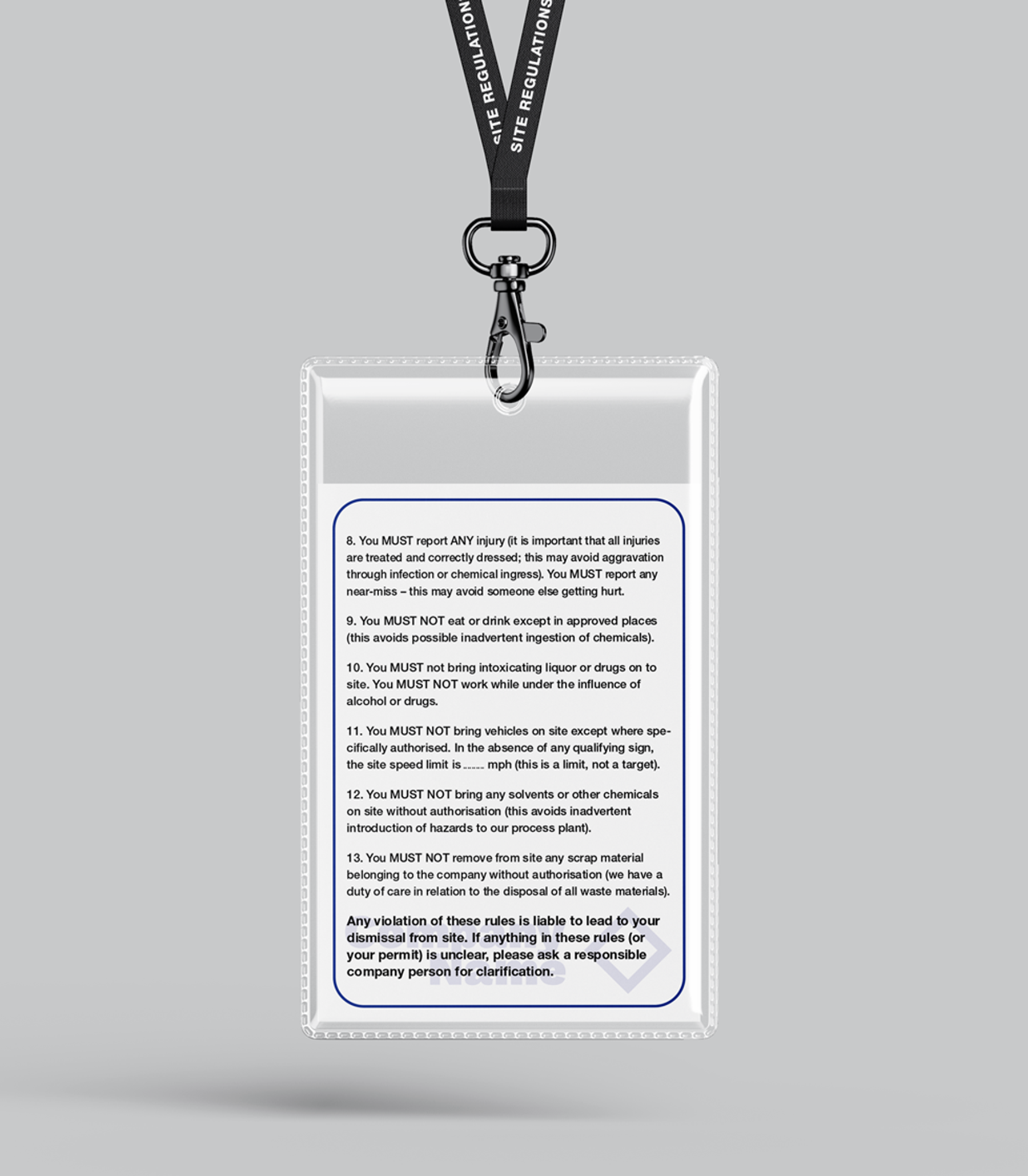 I propose core information should be on an aide memoire pocket-sized card, possibly including a site map if appropriate, that is freely issued and is to be carried by all short-term personnel. Key information such as phone numbers and alarm types might also be duplicated on the site pass that people are required to carry to gain access to site – so that it will be difficult to leave behind.