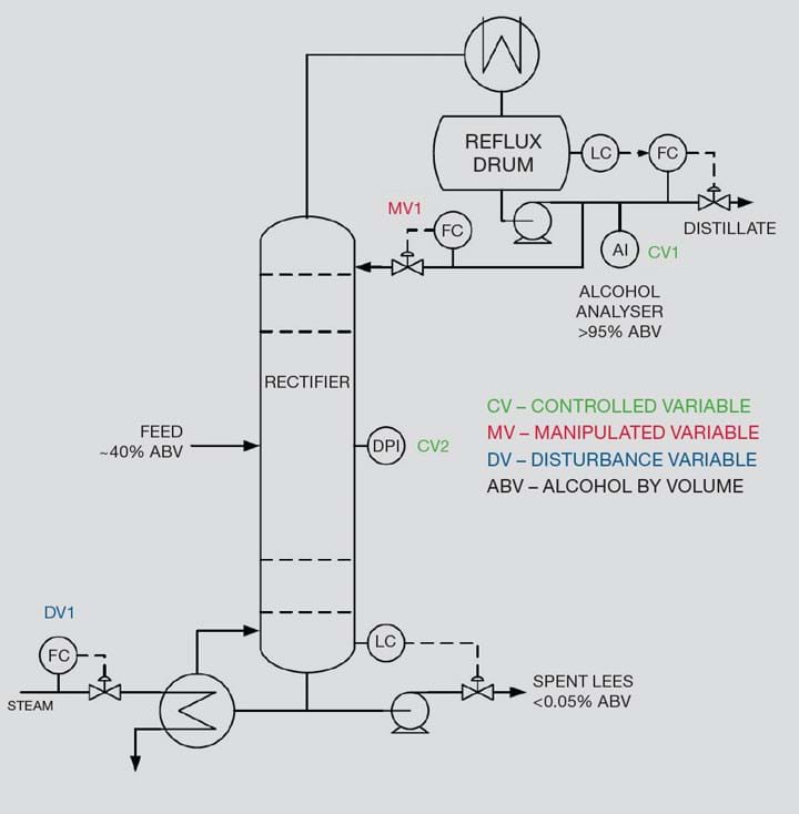 The rectifier distillation column (Figure 1) was selected as a potential candidate for APC due to the very slow dynamic response. For example, following a change in column reflux, it can take up to 6 hours for the distillate concentration to come to steady state.