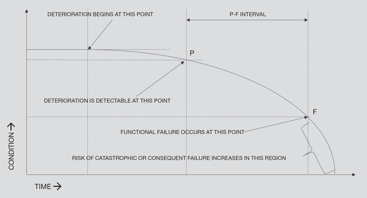 Figure 3 shows the principle behind condition-based maintenance using a P-F Curve4. The X and Y axes represent time and condition of the asset, respectively. F is the point of failure. P represents the point at which a condition monitoring technique can begin to detect potential failure. The technique could detect variations in product quality, process or equipment parameters. Provided it gives a sufficient interval between P and F to perform the required maintenance action then condition-based maintenance avoids costs from: