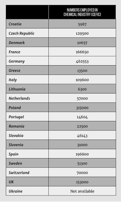 Traditional career routes are in the chemical and energy sectors. CEFIC provides figures for employment on the chemical industry, and Table 4 gives the number of graduates per 1,000 employed and Table 5 the CEFIC figures from which Table 4 was derived. The CEFIC figures include the chemical and petrochemical industry but not the pharmaceutical industry or oil refining, both of which are strong in the UK.