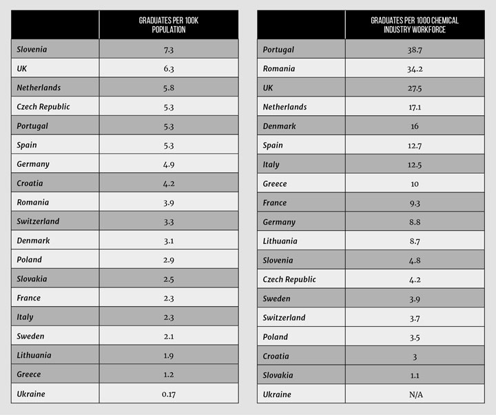 Countries are producing very different numbers per head of population and per 1,000 in the chemical industry workforce. Portugal’s industry is relatively small but is producing graduates going into a wide range of industries and careers with a significant proportion being recruited as consulting engineers. Romania has a long tradition of producing chemical engineers because of the long-standing size of the oil and gas sector. The UK figure is also high possibly because academic programmes and the research base have promoted the value of chemical engineering skills well beyond the traditional employment sectors.